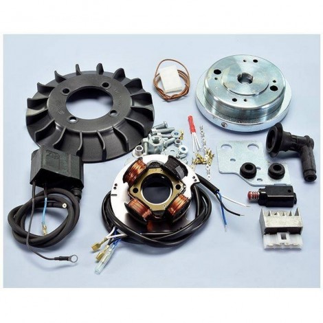 L’accensione ANALOGICA comprende: statore a quattro poli, volano (peso Kg.1,2) con inerzia modificata e ventola di raffreddamento. E’ destinata all’impiego agonistico e prevede il funzionamento delle luci a 12 volt. (questa modifica comporta la sostituzione delle lampade originali). Assicura maggiore ripresa, spunto, allungo e accelerazione.