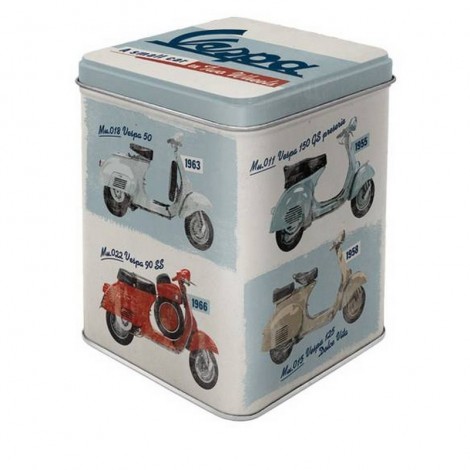 Scatolina da the con chiusura a cerniera - Vespa - Model Chart, 7,5 X 7,5 X 9,5 h cm, capacità: 100 gr. circa, resistente all'uso, rivestimento protettivo della vernice, certificata per uso alimentare.