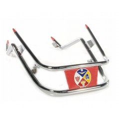 Paraurti anteriore -AMS CUPPINI- Vespa tipo PK Paraurti in look old school per i modelli PK. Si fissa al tuo parafango con 4 viti. Le viti si inseriscono dall'interno del parafango. Cromato con i vecchi loghi Cuppini Rosso .